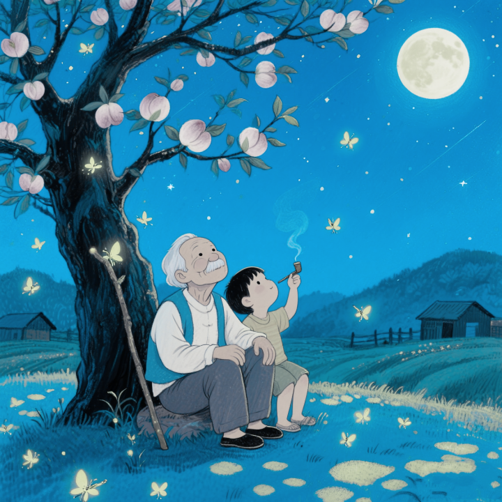 想起白天在城里,抬头只能看见月亮,星星全躲在路灯后面。那些星星离人间多远呢?课本上说最近的也要几光年,也就是说,此刻看见的光,是它几年前发出来的。原来人们看的不是现在的星,是过去的星。就像老人去世那年种的桃树,今年结了果,咬开时,汁水漫过舌尖,还是他当年蹲在树底下,用粗粝的手掌摸树干的温度。